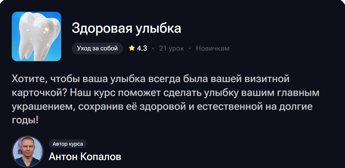 Он из тех врачей, которые не просто лечат — а объясняют. Тех, после приёма у которых выходишь не с тревогой, а с пониманием. Именно это понимание он упаковал в курс «Здоровая улыбка» — **21 занятие**, которые заменяют годы случайного гугления и тревожного чтения медицинских форумов.